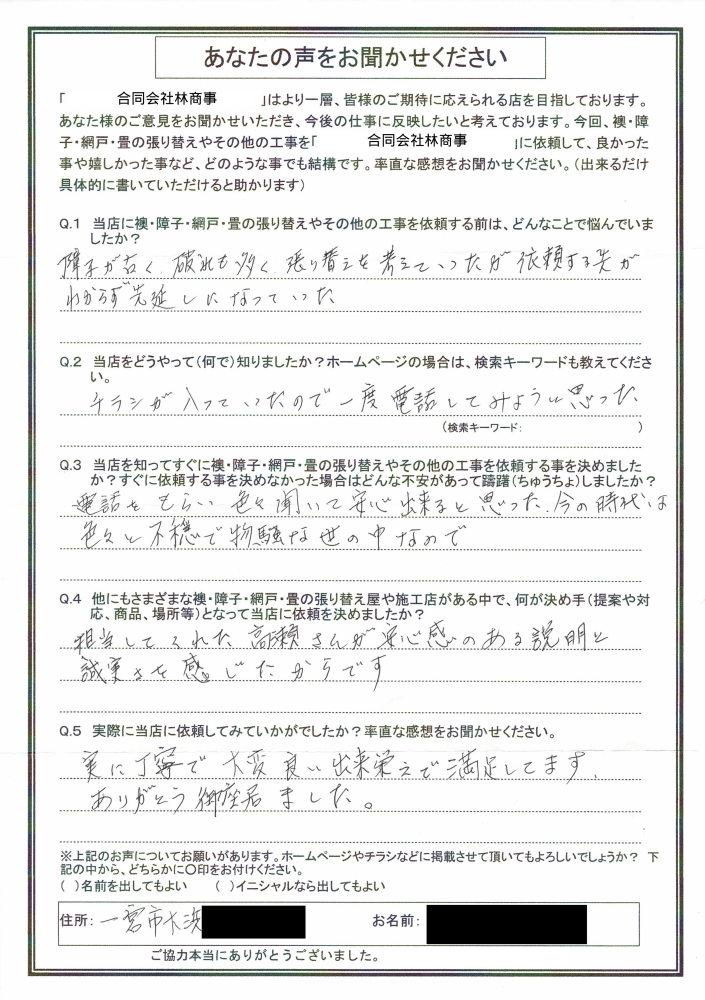 一宮市大浜 F・K様~安心感のある説明と誠実さを感じた~ 2025 8/24 お客様の声 一宮市 2025年8月24日 「安心感のある説明と誠実さを感じた」と嬉しいお言葉をいただきました。 F・K様、この度は誠にありがとうございました。 お客様の声 一宮市 よかったらシェアしてね! URLをコピーしました! URLをコピーしました! 一宮市西大海道 T・T様~職人の感じが良く親切。張替えもきれいな仕上がり~ 一宮市千秋町 K・K様~対応が丁寧で、高価なものを無理にすすめないところが良かった~ この記事を書いた人 admin 関連記事 一宮市大山町 ふすま張替え 2025年9月4日 一宮市時之島 ふすま張替え 2025年9月4日 一宮市丹陽町 ふすま張替え 2025年9月4日 一宮市春明 ふすま張替え 2025年9月4日 一宮市瀬部 ふすま張替え 2025年9月4日 一宮市北方町 障子張替え 2025年9月4日 一宮市浅井町 障子張替え 2025年9月4日 一宮市西大海道 網戸張替え 2025年9月4日 コメント コメントする コメントをキャンセルコメント ※ 名前 ※ メール ※ サイト 次回のコメントで使用するためブラウザーに自分の名前、メールアドレス、サイトを保存する。