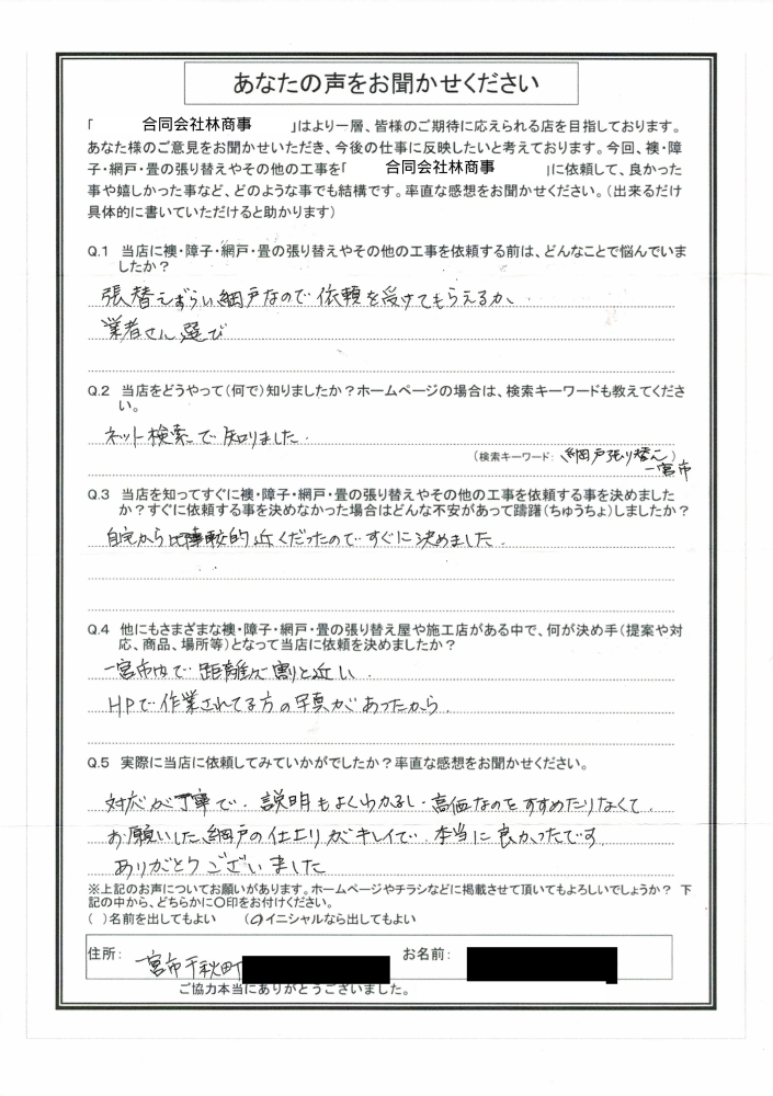 一宮市千秋町 K・K様~対応が丁寧で、高価なものを無理にすすめないところが良かった~ 2025 8/24 お客様の声 一宮市 2025年8月24日 「対応が丁寧で、高価なものを無理にすすめないところが良かった」とご感想をいただきました。 K・K様、ありがとうございました。今後ともよろしくお願いいたします。 お客様の声 一宮市 よかったらシェアしてね! URLをコピーしました! URLをコピーしました! 一宮市大浜 F・K様~安心感のある説明と誠実さを感じた~ 一宮市浅井町 I・K様~地元の業者で対応も早かった。見積や納品の対応も親切かつ丁寧だった~ この記事を書いた人 admin 関連記事 一宮市大山町 ふすま張替え 2025年9月4日 一宮市時之島 ふすま張替え 2025年9月4日 一宮市丹陽町 ふすま張替え 2025年9月4日 一宮市春明 ふすま張替え 2025年9月4日 一宮市瀬部 ふすま張替え 2025年9月4日 一宮市北方町 障子張替え 2025年9月4日 一宮市浅井町 障子張替え 2025年9月4日 一宮市西大海道 網戸張替え 2025年9月4日 コメント コメントする コメントをキャンセルコメント ※ 名前 ※ メール ※ サイト 次回のコメントで使用するためブラウザーに自分の名前、メールアドレス、サイトを保存する。
