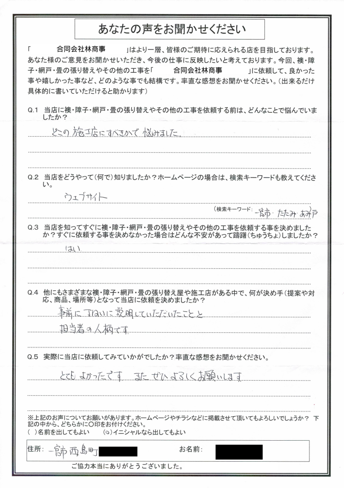 一宮市浅井町 I・K様~地元の業者で対応も早かった。見積や納品の対応も親切かつ丁寧だった~